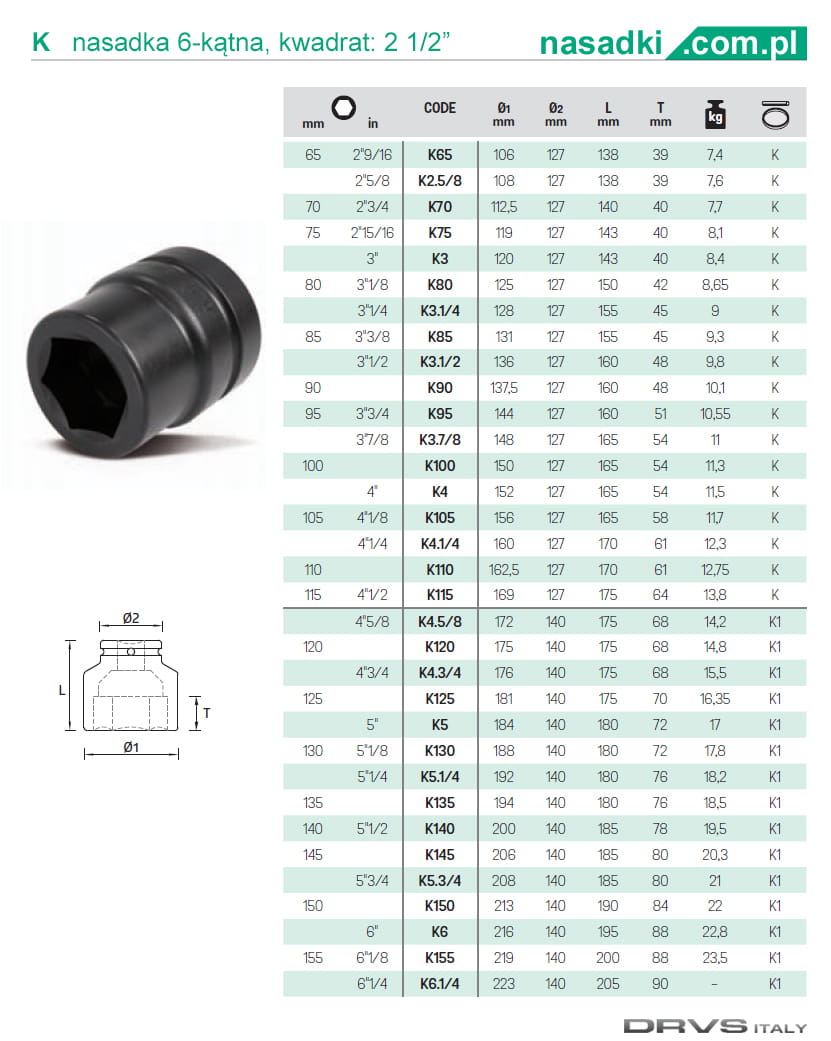 | Rozmiar klucza | Wysokość całkowita | Średnica zewnętrzna |