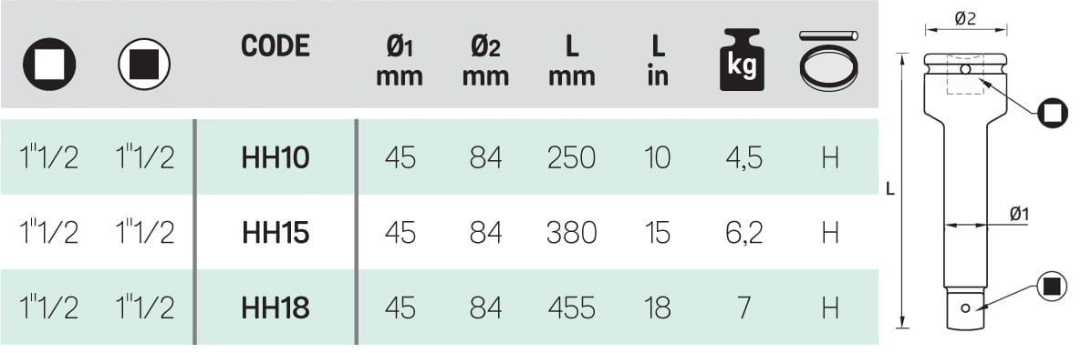 Nasadka 1 1/2" przedłużająca kwadrat wiodący. Długość całkowita 250 mm.